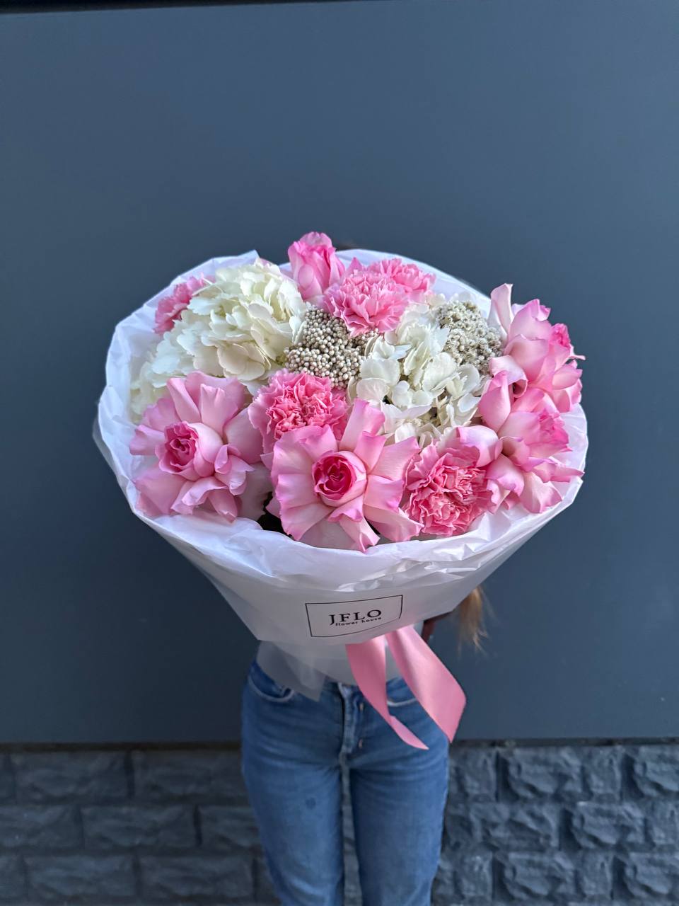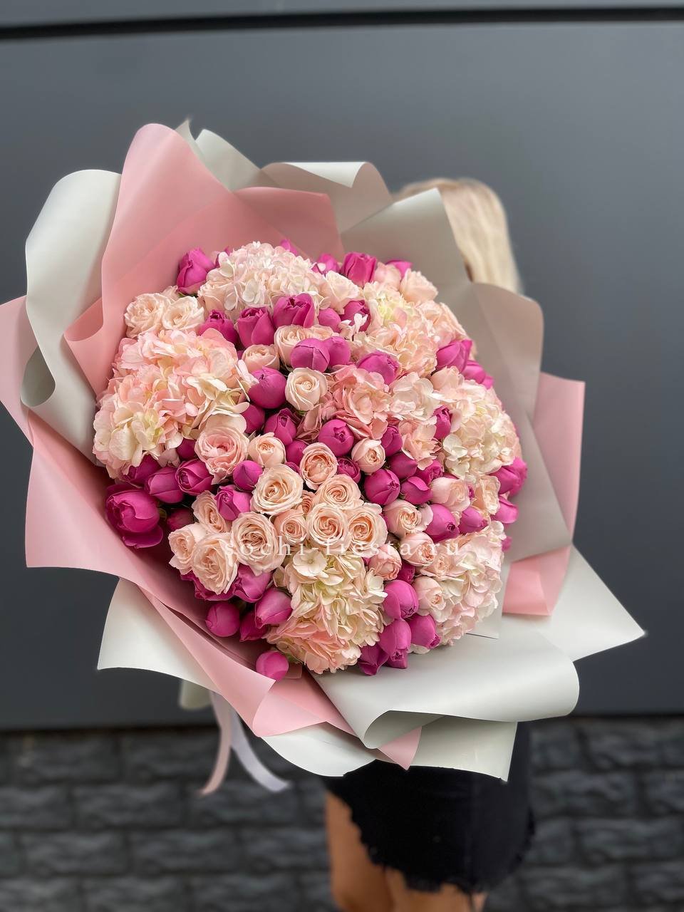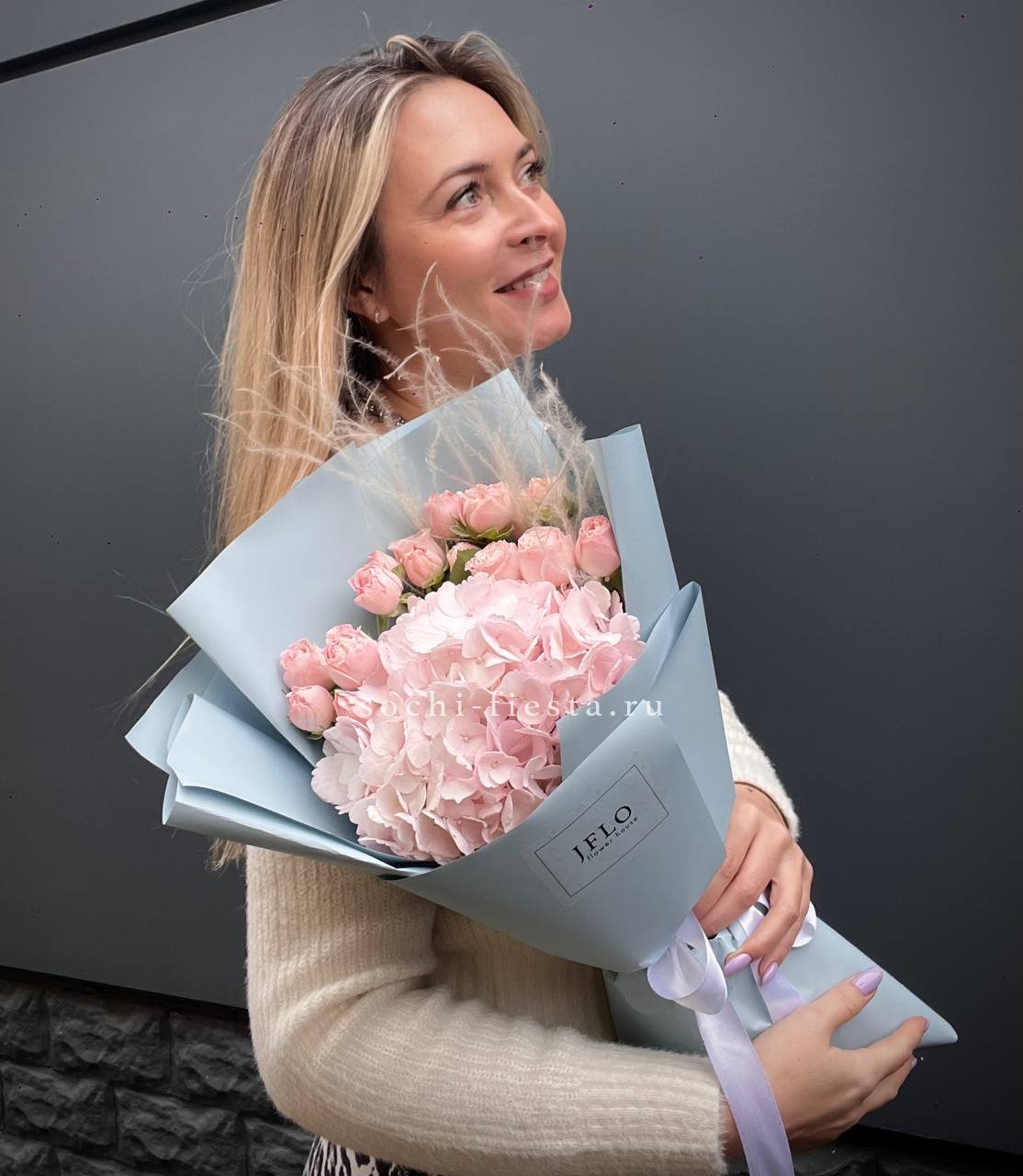 Воздушная гортензия окружена розовыми бутонами и душистой маттиолой. Лимониум добавляет букету лёгкую дымку, а общий силуэт остаётся мягким и собранным.