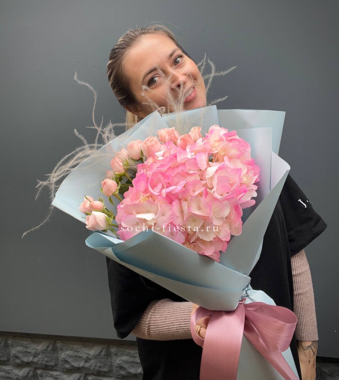 гортензия, розовые розы, кустовые розы, маттиолы,, лимониум лента и дизайнерская пленка.