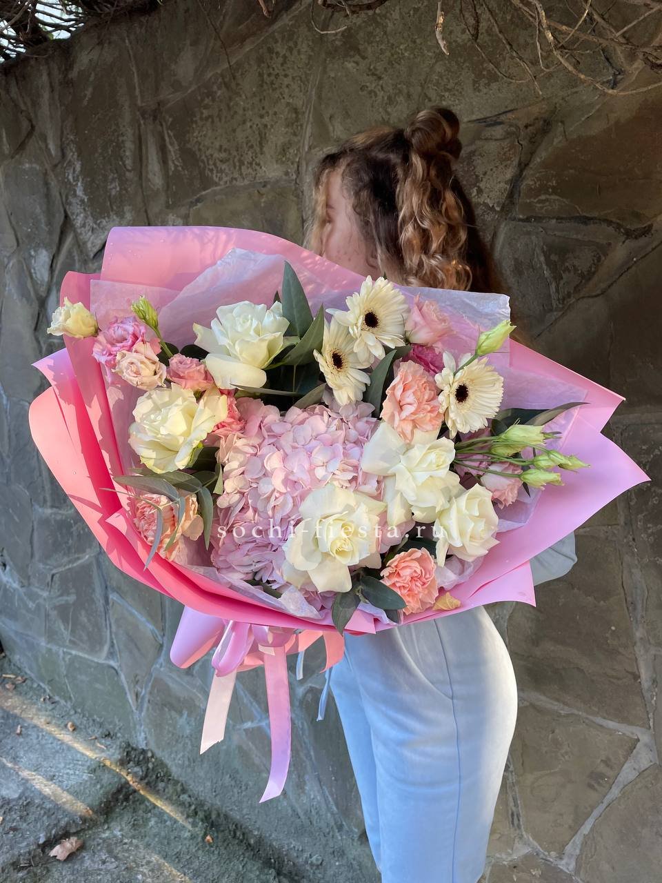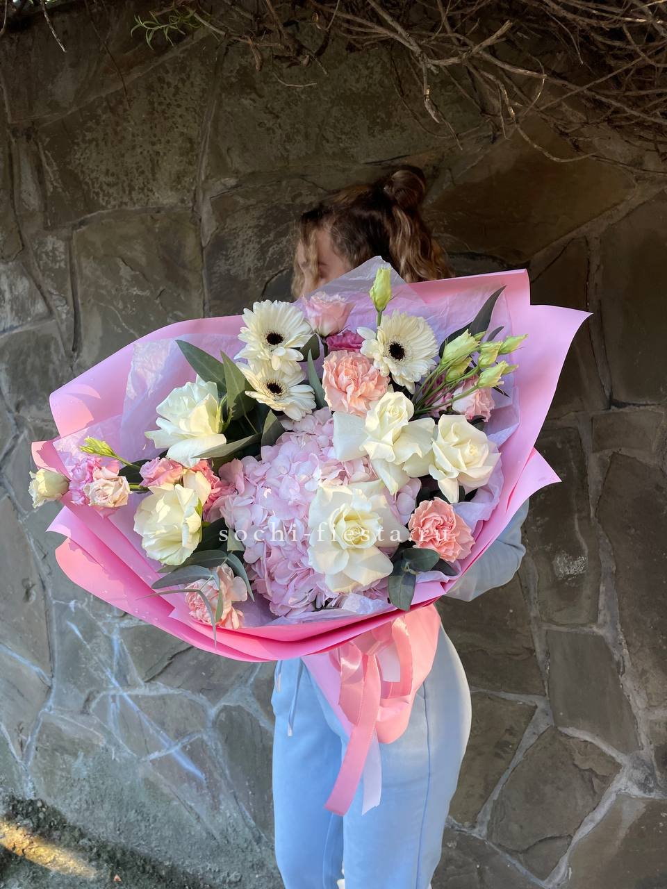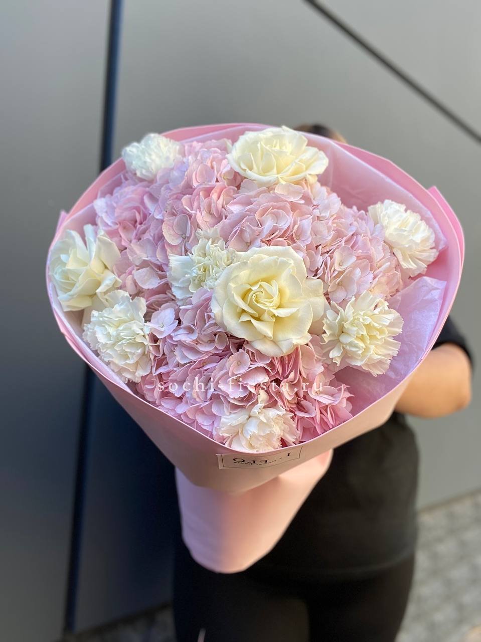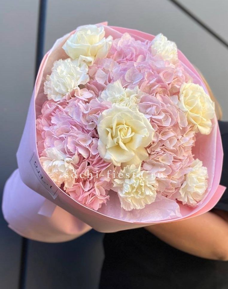 розы, гортензия, альстромерии, маттиола лента и дизайнерская пленка.