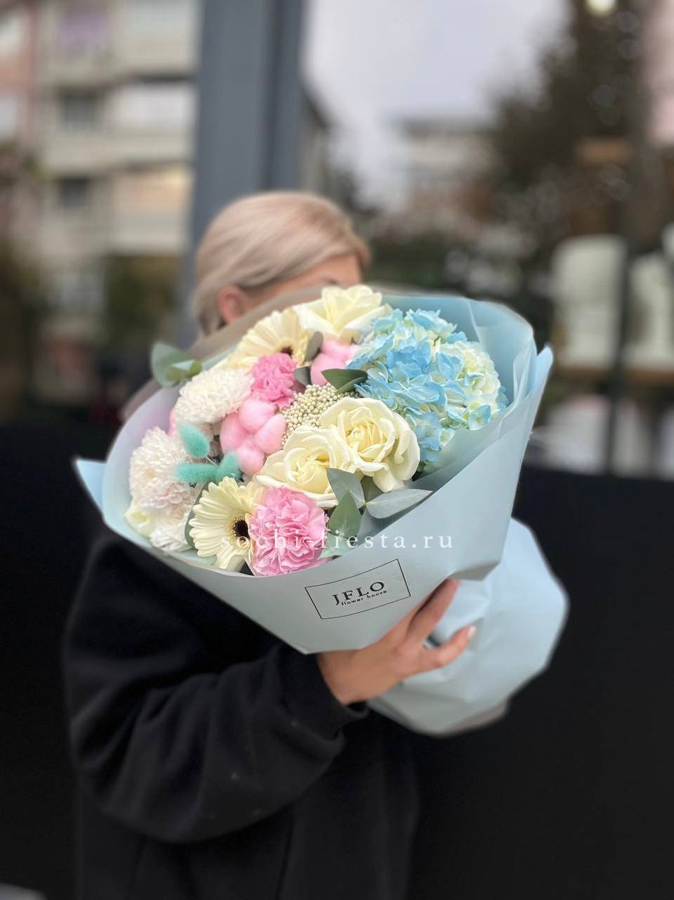 Яркие герберы встречаются с розами и хризантемами в плотной композиции. Гортензия добавляет объём, а хлопок создаёт мягкую текстурную волну по краю букета.