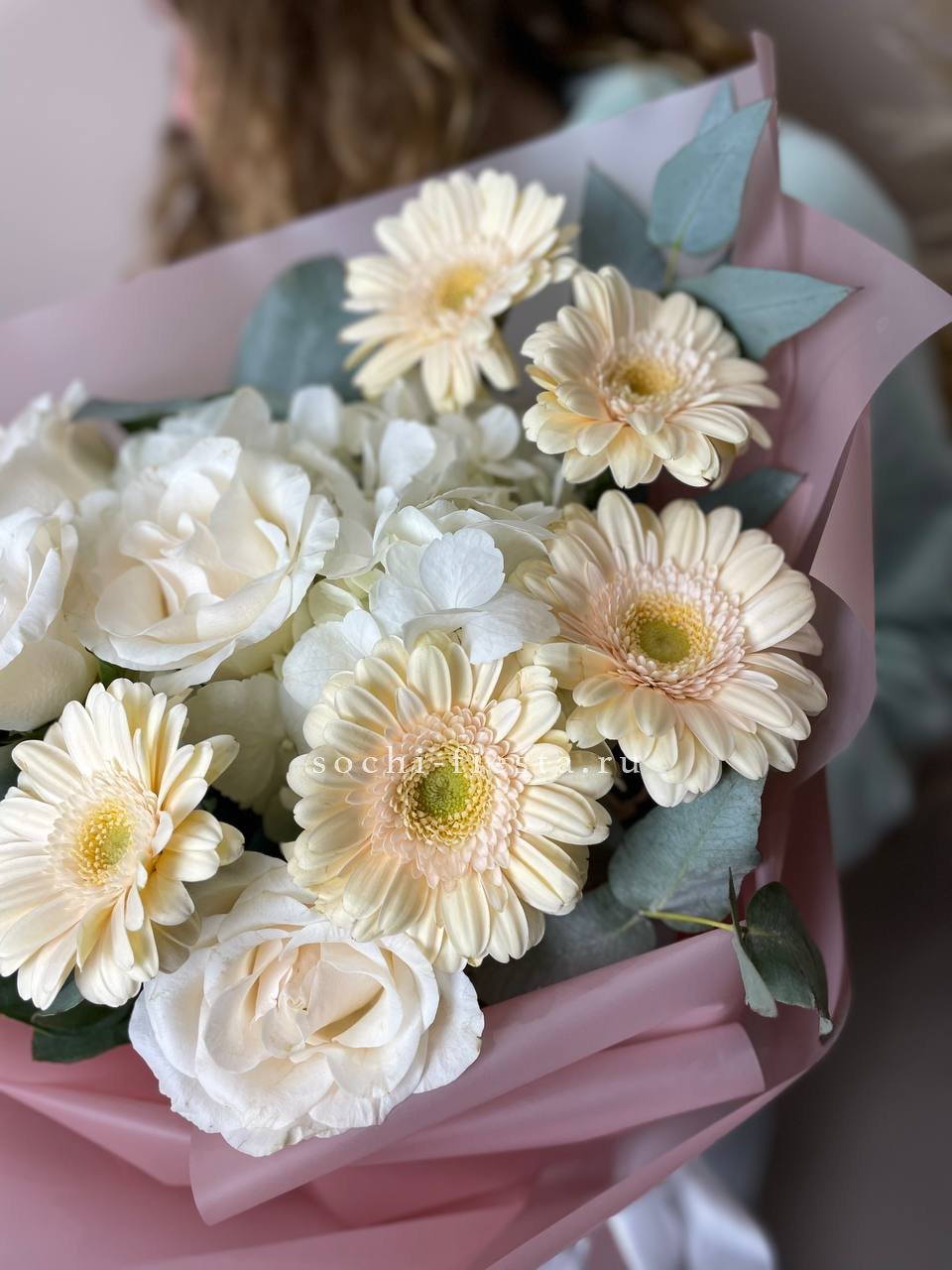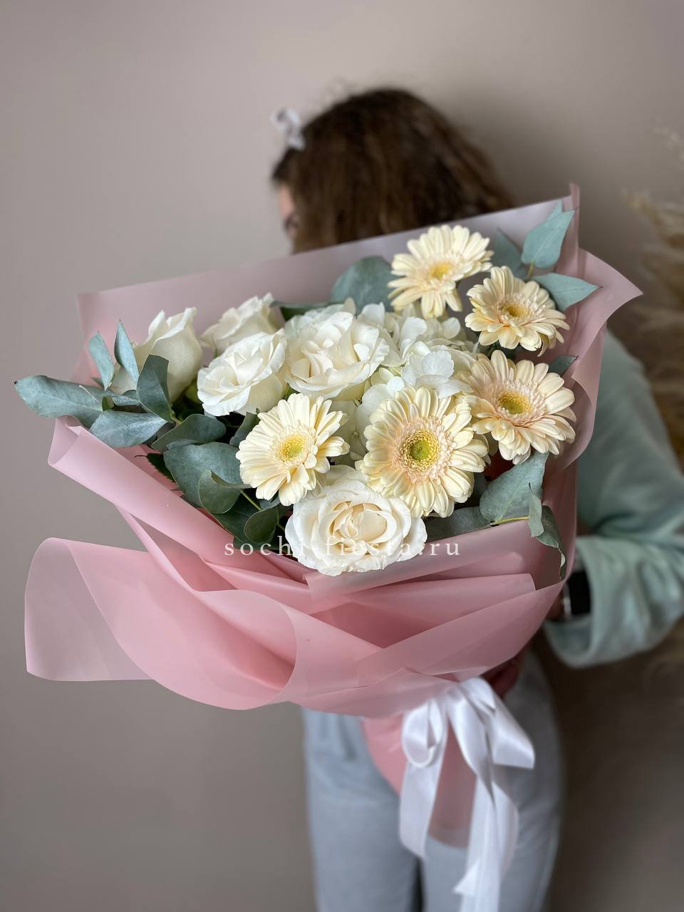 Озотамнус и диантусы вносят воздушность между классическими розами. Эвкалипт обрамляет композицию серебристыми нотами, создавая легкую структуру без лишней плотности.