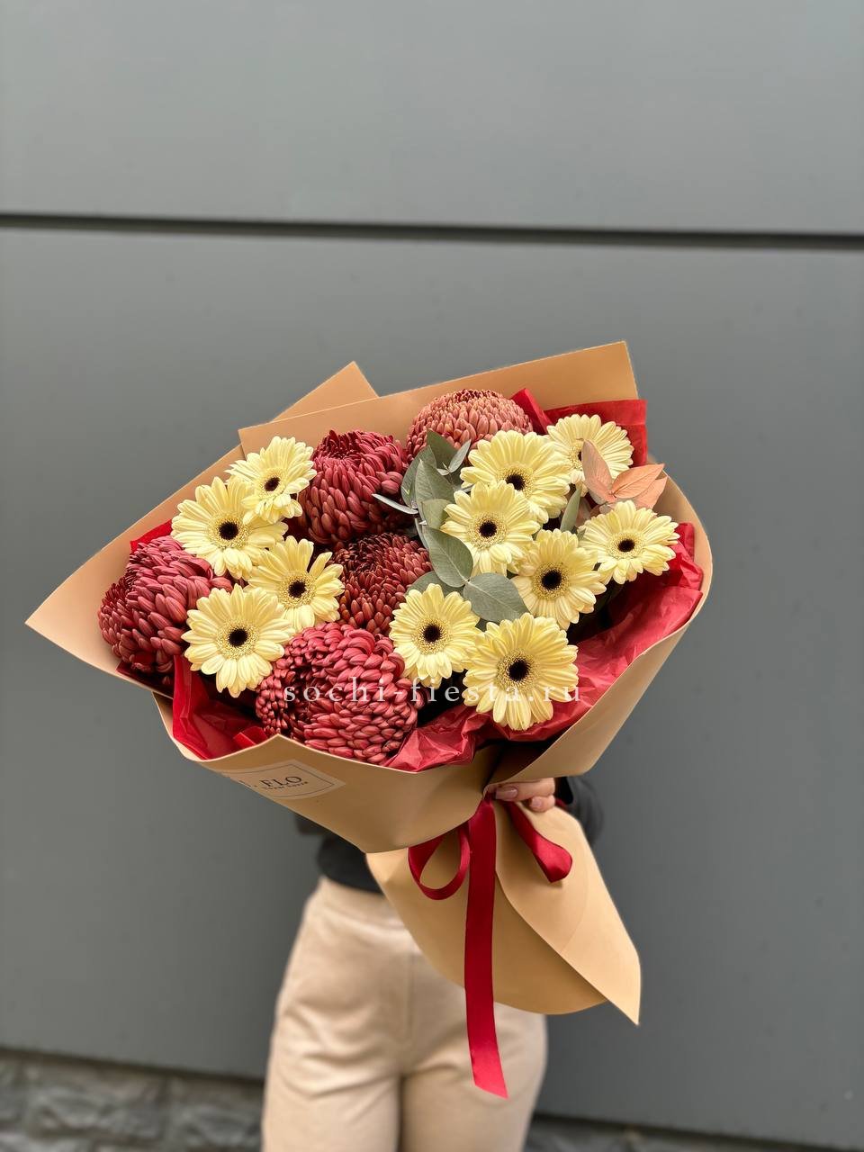 Солнечные герберы встречаются с кудрявыми хризантемами Бигуди в ярком жизнерадостном букете. Эвкалипт добавляет свежести и завершённости всей композиции.