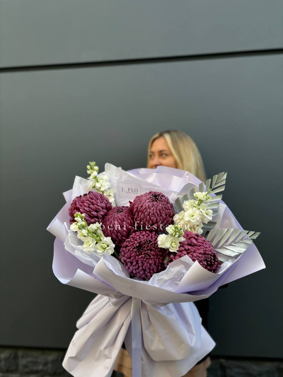 Воздушные хризантемы Бигуди с волнистыми лепестками встречаются с мягкими облаками маттиолы и хлопка. Листья чика добавляют графичности, а кустовая хризантема и эустома создают объемную текстуру в каждом слое.