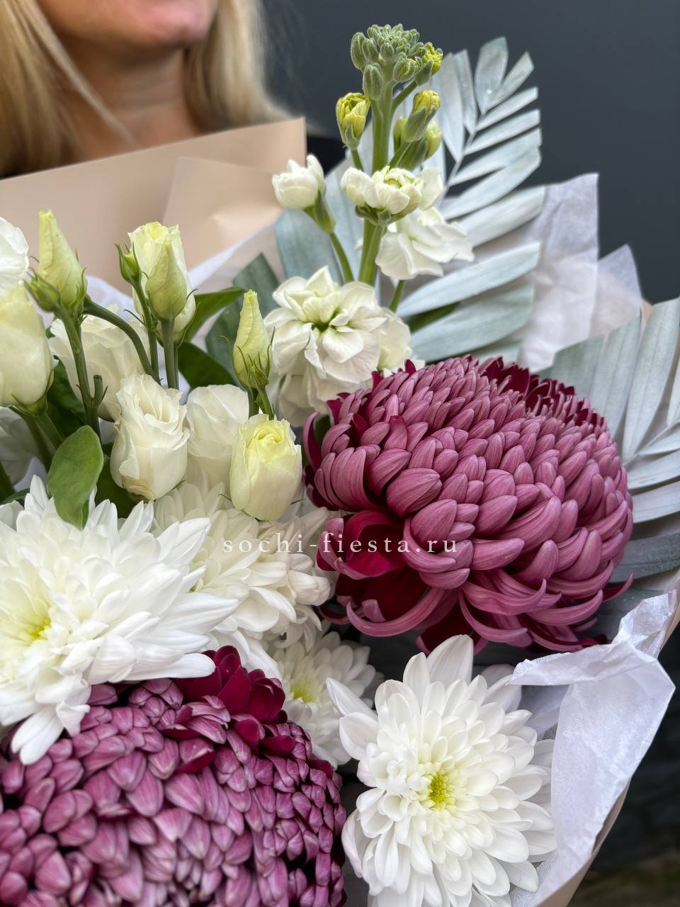 хризантемы Бигуди, маттиола, лист чика (возможна замена на эвкалипт), хризантема кустовая,  эустома, хлопок, лента, дизайнерская упаковка.