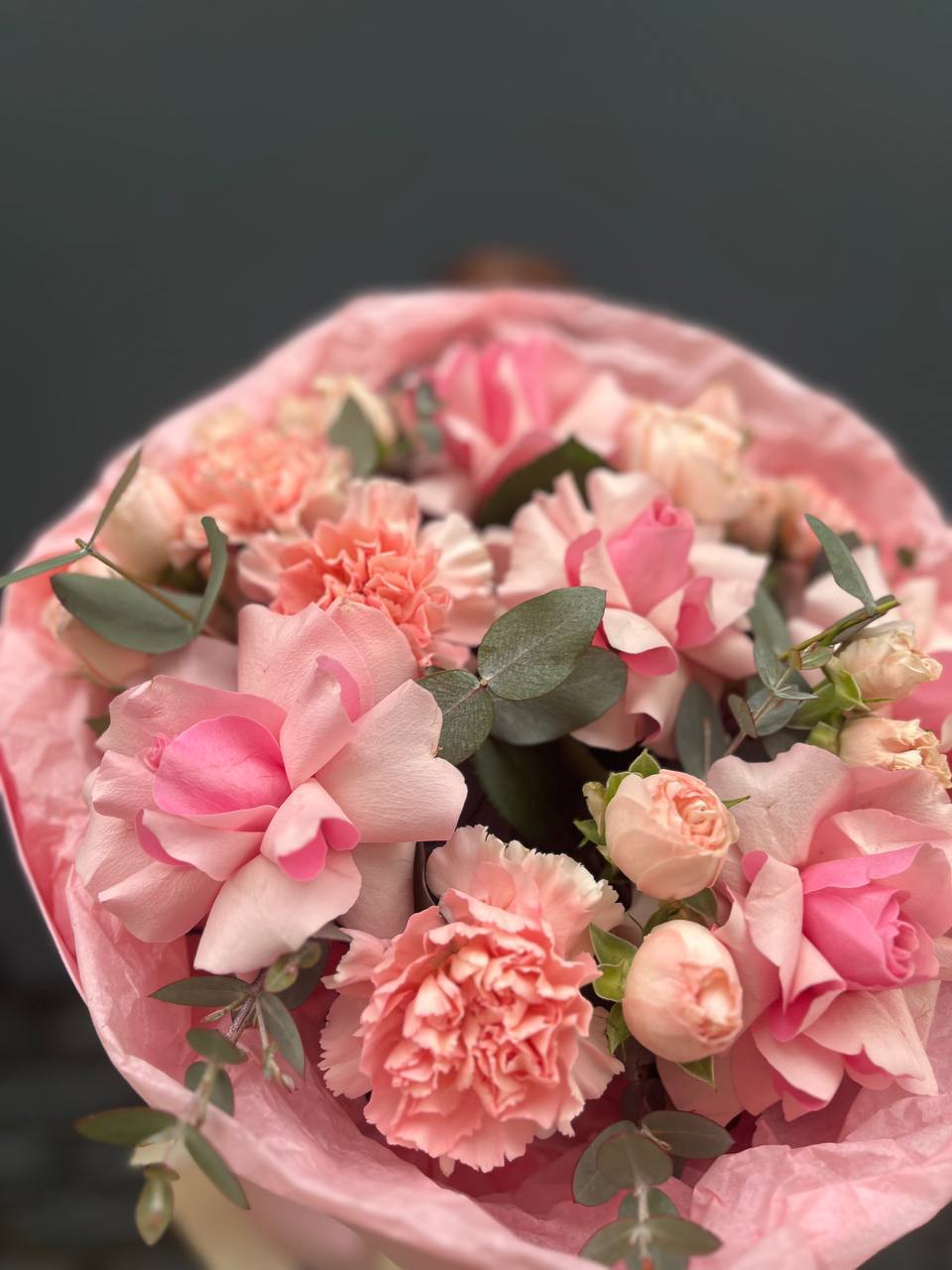 Диантусы и кустовые розы создают воздушную композицию с мягкими переходами оттенков. Бутоны распределены свободно, образуя естественный силуэт без жесткой геометрии. Букет хорошо держит форму и долго сохраняет свежесть.